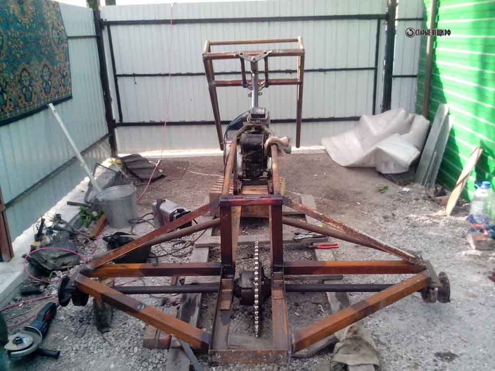 - Сваривается надёжная и устойчивая к вибрированиям двигателя рама. Она изготовляется из стальных труб, стыки которых провариваются со стальными уголками для укрепления конструкции;