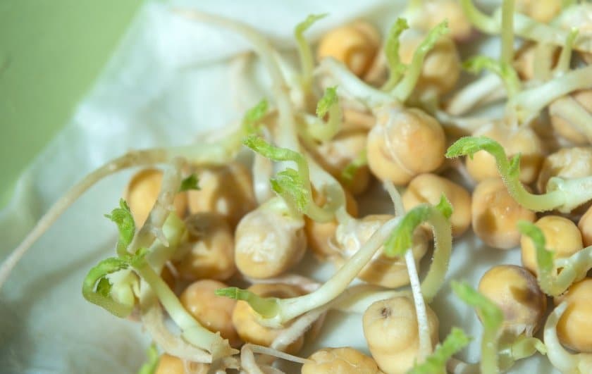 - Набухшие горошины оборачивают влажной марлей или тканью, и отправляют на 2-3 суток в теплое помещение для проращивания.