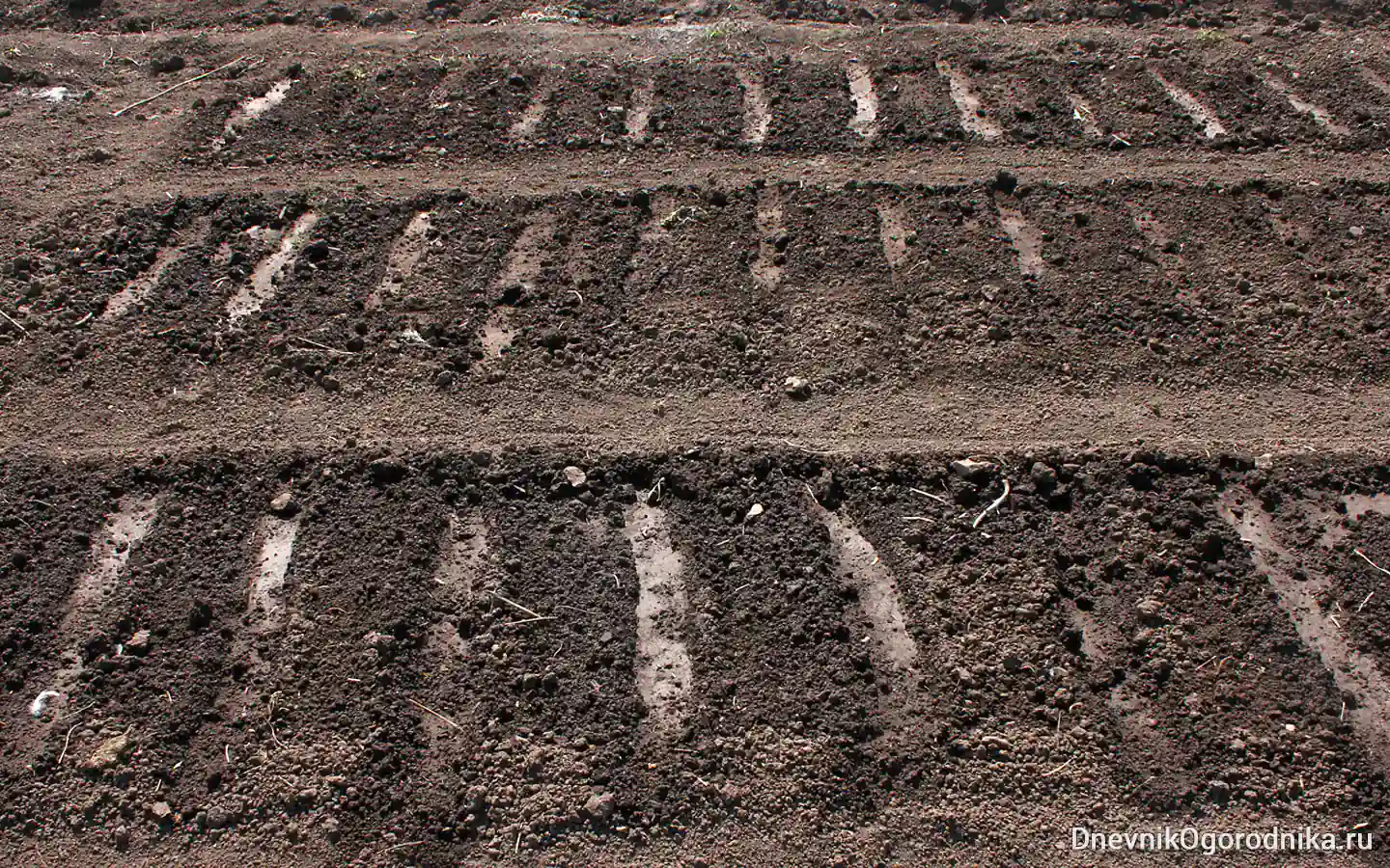 Расстояние между рядами зависит от сорта: для ранних – 20 см, для поздних – 30 см. Если ко времени посева почва сильно высохла, то полить грядки рекомендуется не в день посева, а на 1-2 дня раньше, чтобы почва грядки стала равномерно влажной.
