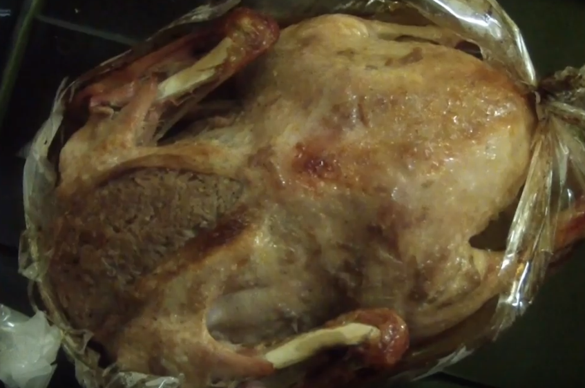 Далее после всех манипуляций заверните птицу в фольгу, получится комочек, который должен в таком состоянии постоять и промариноваться 2 часа. По истечение времени поставьте выпекаться утку, не открывая фольгу на 2 часа, температура жарки — 200 градусов.