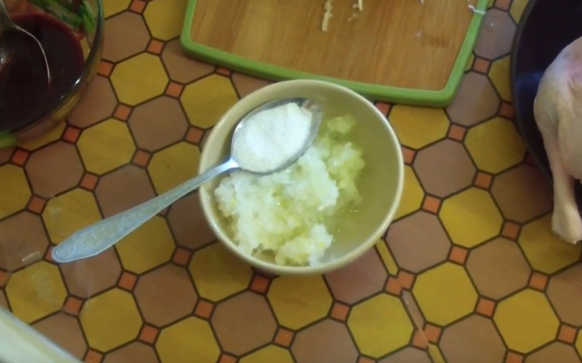 - Для натирания тушки приготовить смесь из нескольких ложек растительного масла, черного и красного перцев, соли и выдавленного чеснока. Этой заготовкой смазать снаружи и внутри тушку и держать в холодильнике под пищевой пленкой 2 часа.