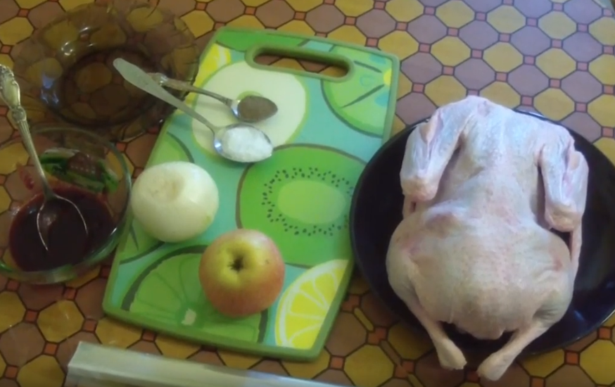 - В замаринованную тушку вложить лимон и лук, «запечатать» отверстие удобным способом: зубочистками или иглой с ниткой.