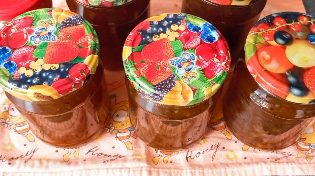 Сходу опосля того, как в крайний раз довели до кипения массу, разливаем его по баночкам, прочно закрываем крышками. Даем остыть и отправляем к остальным заготовкам.