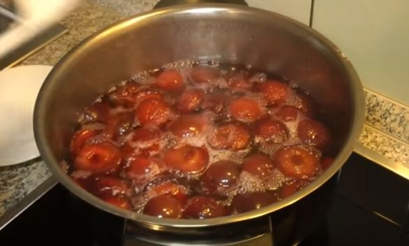 На третий день вы увидите, что сахар растворился полностью. Фрукты выглядят сочными, набухшими, поскольку, внутри мякоти — сироп. Ставим кастрюлю на медленный огонь. Доводим до кипения и варим всего 3 минуты. Снова снимаем кастрюлю и оставляем ее, еще на 24 часа.