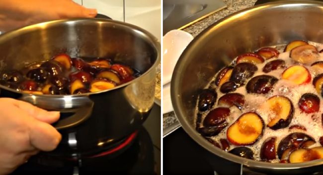 На следующий день перемешаем половинки слив и поставим на огонь. Больше перемешивать не будем. Иначе фрукты потеряют свою форму. Ждем закипания. Периодически поднимаем кастрюлю и слегка потряхиваем содержимое.
