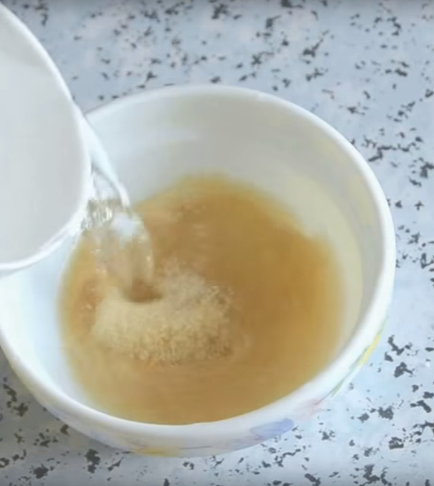 7. Тем временем же, всыпаем желатин в мисочку и заливаем небольшим количеством теплой воды. Хорошо перемешиваем, не должны остаться комочки.