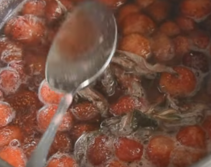 Для усиления вкуса, можно добавить веточку свежей или сухой мяты. Потом мы ее уберем. И, ставим кастрюлю на слабый огонь. Через какое то время клубника пустит сок и начнет образовываться пенка, которую нужно снять. И так, после закипания варим еще минут 5.