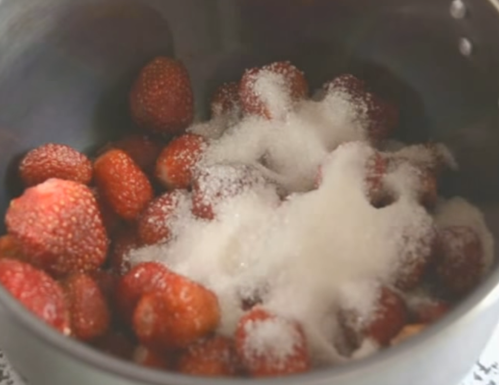 - Настаиваем клубнику в сахаре в течение 10-12 час. Затем добавляем оставшийся песок и ставим массу на огонь.