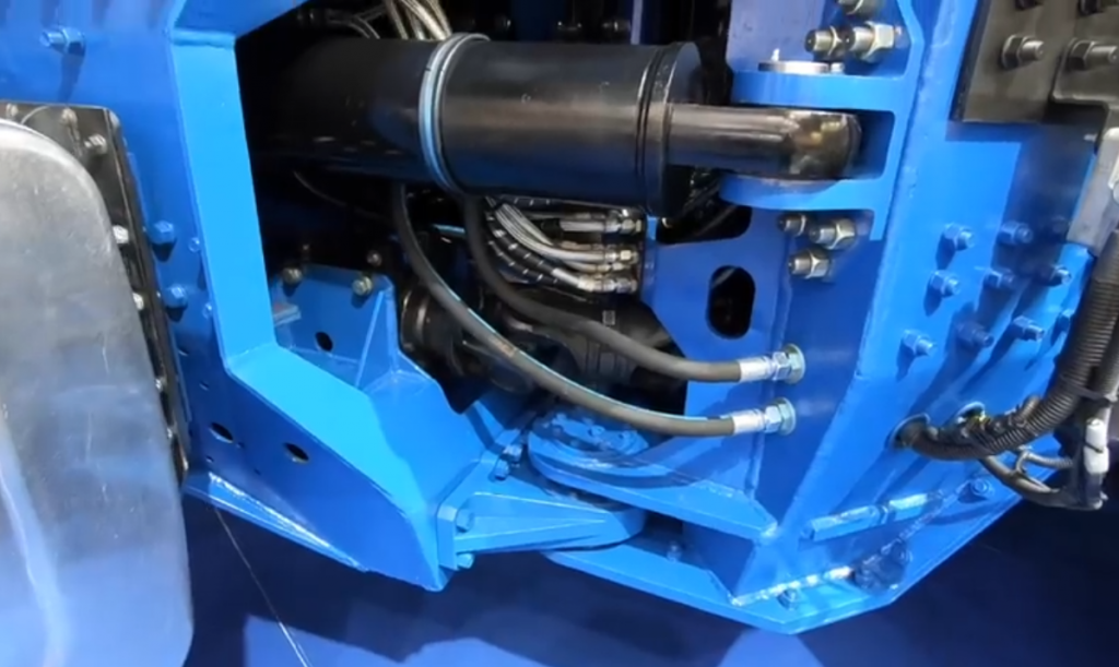 - Узел сочленения. Он состоит из двух коробчатых конструкций листового типа, которые соединены между собой при помощи двух шарниров. Поворот вокруг оси происходит благодаря гидравлическим цилиндрам. Угол складывания не может превышать 45°.