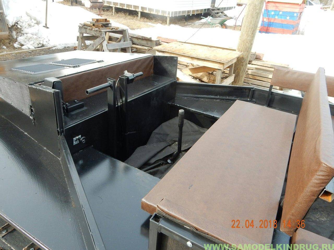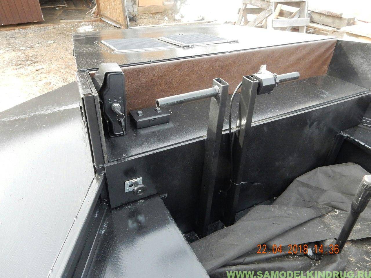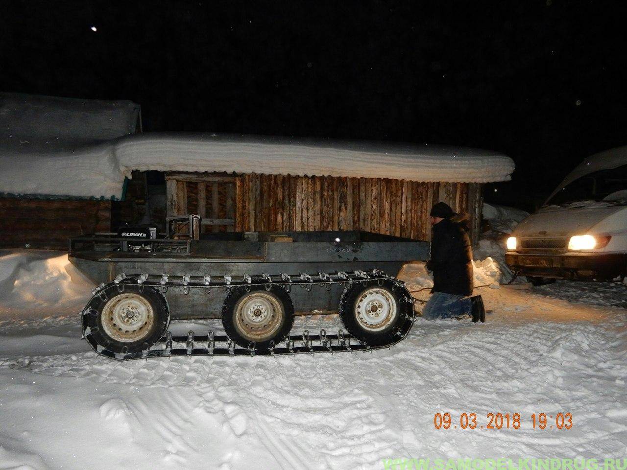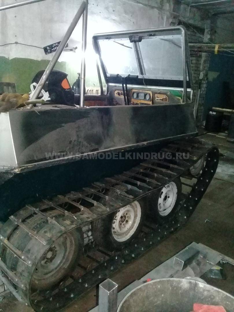 Самодельный легкий гусеничный вездеход с двигателем Lifan 17 л/с, корпус-лодка, плавающий вездеход на гусеницах легкого класса предназначен для охоты и рыбалки, фото и описание гусеничного вездехода с двигателем лифан прилагается. Легкий гусеничный вездеход имеет двигатель мощностью 17 л/с (лошадиных сил) стартер . КПП (коробка переключения передач) ВАЗ 2110. Вариатор Сафари+Буран одноопорный+ремень рубена 33, мост классика, передаточное число 1:4, тормоза ВАЗ 2109 дисковые, карданный вал самодельный.