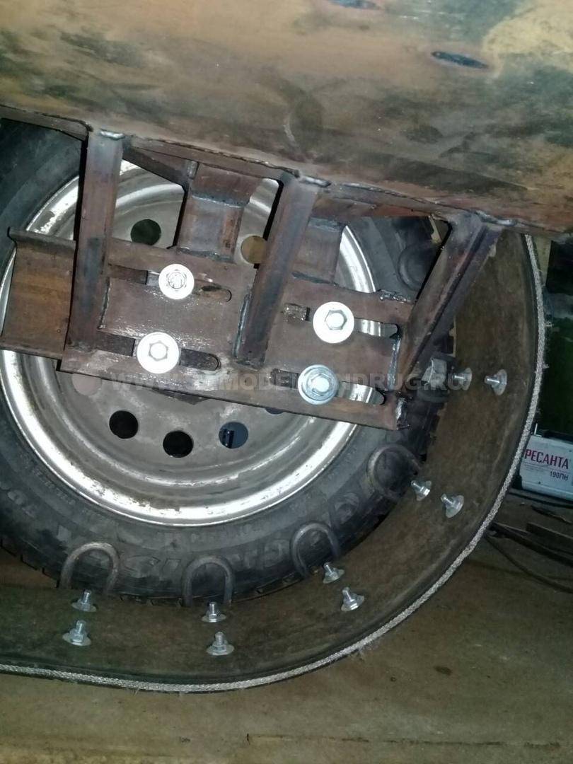 Для повышения надежности болотохода приводные и опорные колеса крепятся не на 4, а на 5 болтов.