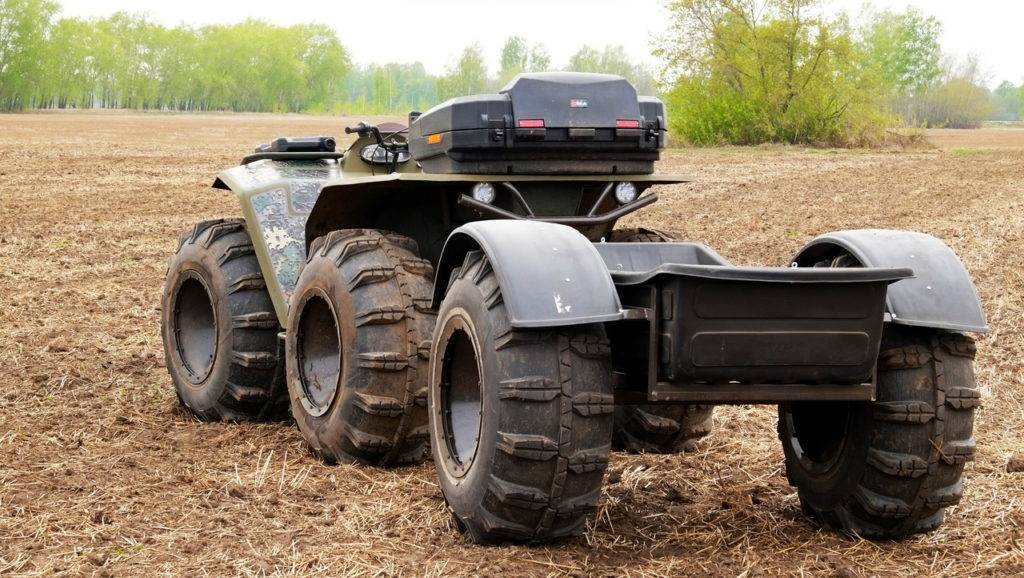 Благодаря своеобразному техническому решению тяжёлый, массой 700 кг, квадроцикл оказывает минимальное давление на грунт и имеет положительную плавучесть даже с водителем и пассажиром в седле. При преодолении водных преград он вне конкуренции!