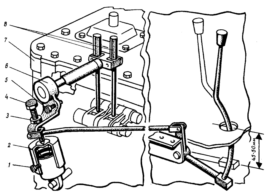 - Коригуються тяги таким чином, щоб відстань від важеля до нижньої кромки кабіни становило 50 міліметрів у включеному режимі.