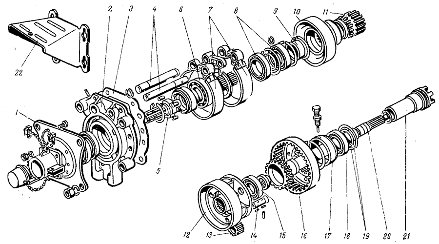 Рис. 2.8.26. Взаимное расположение деталей заднего BOM: 1 — плита; 2 — крышка ВОМ; 3 — прокладка; 4 — оси; 5 — вал заднего ВОМ; 6, 8, 15, 18 — подшипники; 7 — тормозные ленты с накладками; 9 — втулка; 10 — барабан; 11 — солнечная шестерня; 12 — водило; 13 — сателлит; 14 — ось сателлита; 16 — шестерня коромысла; 17 — стакан; 19 — стопорные кольца; 20 — вал; 21 — муфта; 22 — кожух ВОМ.
