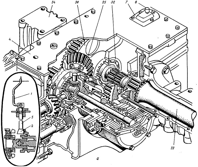 Убедившись в надежности фиксации стакана с корпусом, снимают стакан в сборе. При необходимости разборки зажимают его в струбцине или под прессом и выворачивают стопорный болт 4. Обнаруженные дефектные детали заменяют. Для сборки также используют струбцину или пресс. При неисправности кулачковой муфты снимают кабину и отсоединяют коробку передач от заднего моста. Затем выполняют операции, показанные на рисунке 2, и заменяют изношенные детали