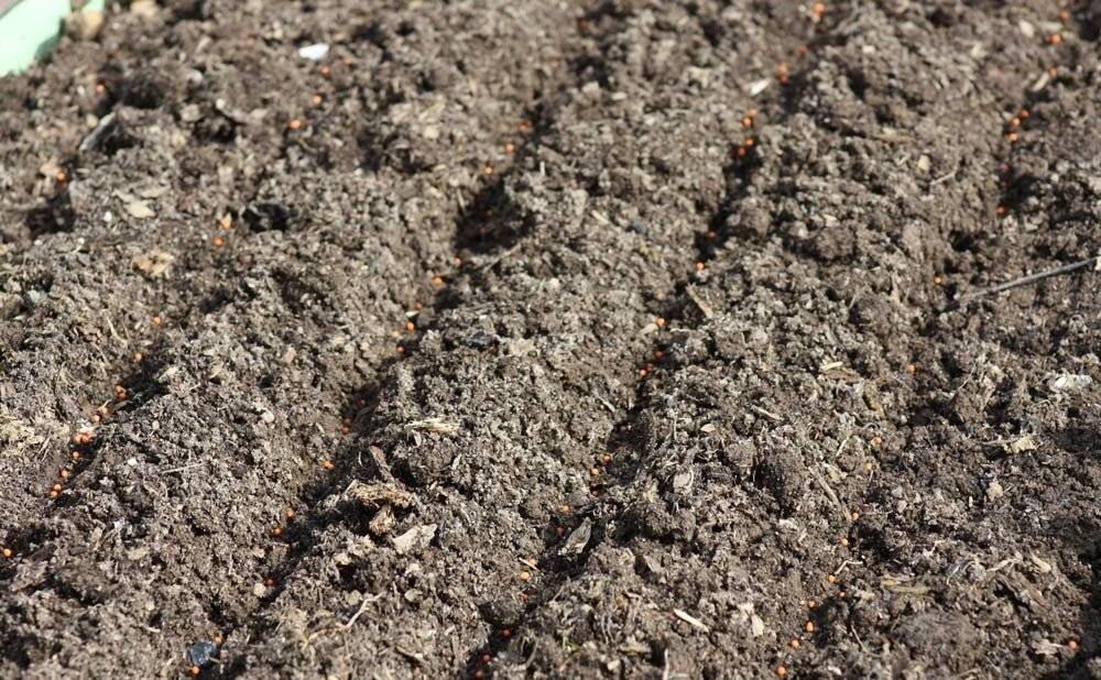 На каждый квадратный метр вносят по ведру компоста или перегноя (но НЕ свежего навоза!) и по 30-40 грамм суперфосфата или комплексного минерального удобрения. А чтобы сделать почву максимально лёгкой, перед посевом выполняют перекопку на глубину 1,5 штыка лопаты.