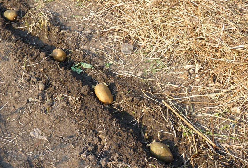 Второй способ посадки – в неглубокие (до 6 см глубиной) канавы и присыпание грунтом до высоты 20-25 см.