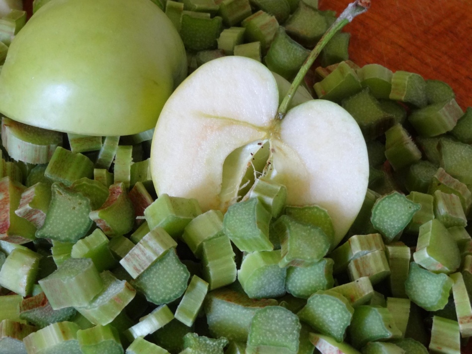 Более насыщенный, но не менее вкусный и полезный вариант. Тщательно промойте ревень и яблоки. Очистите стебли от шкурки, а яблоки избавьте от перегородок и кожуры, нарежьте их мелкими кубиками. Также нарежьте курагу.