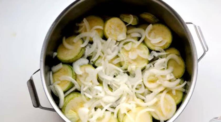 Лук нашинковать тонкими полукольцами, положить на кабачок в кастрюлю.