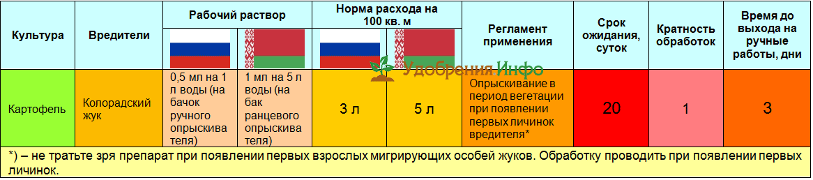 Насекомые перестают питаться через 6-8 часов и погибают через 2-3 суток после обработки. Период защитного действия длится до 3-х недель. После обнаружения вредителя на картофельных листьях проводят 2-3 обработки через 18-20 дней. Обработку нужно проводить после захода солнца.